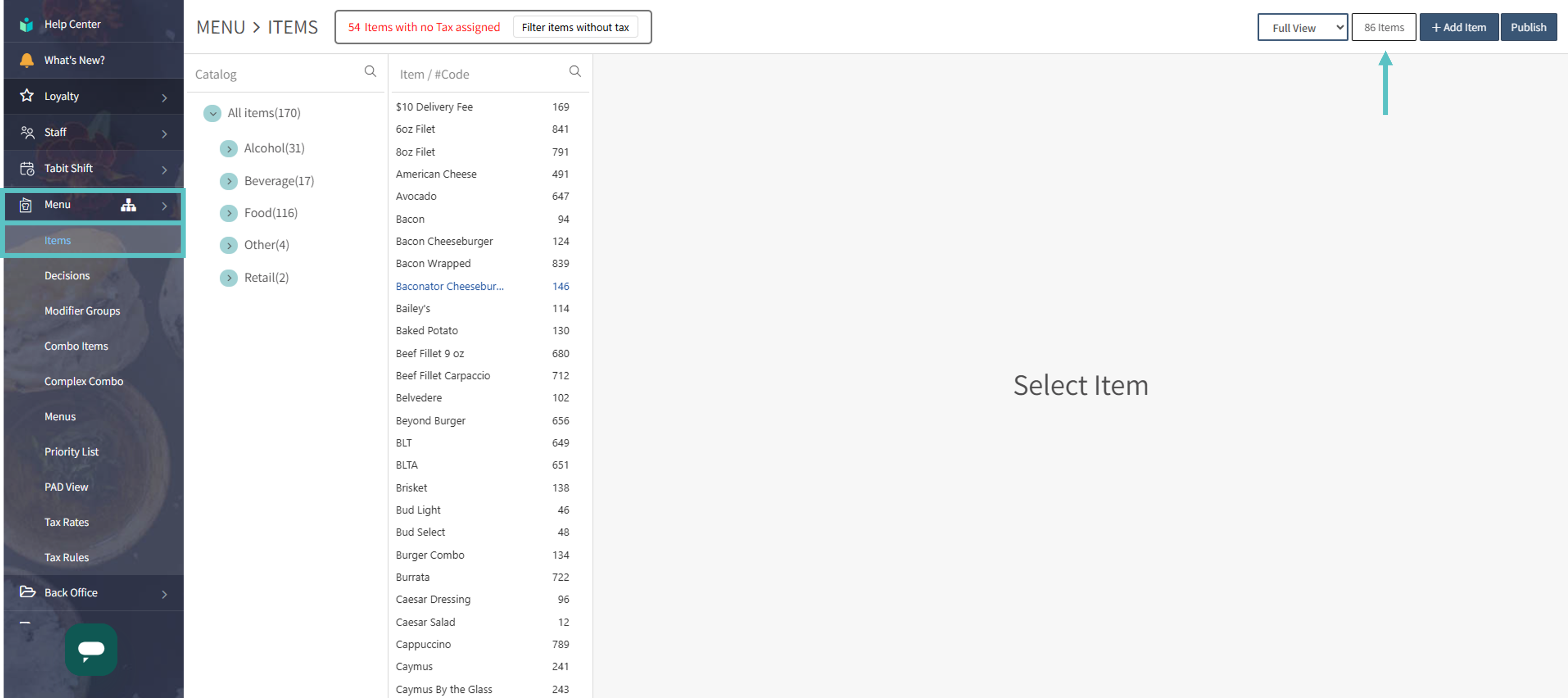 In Tabit Office, go to Menu > Items and select the 86 Items tab on the top right.