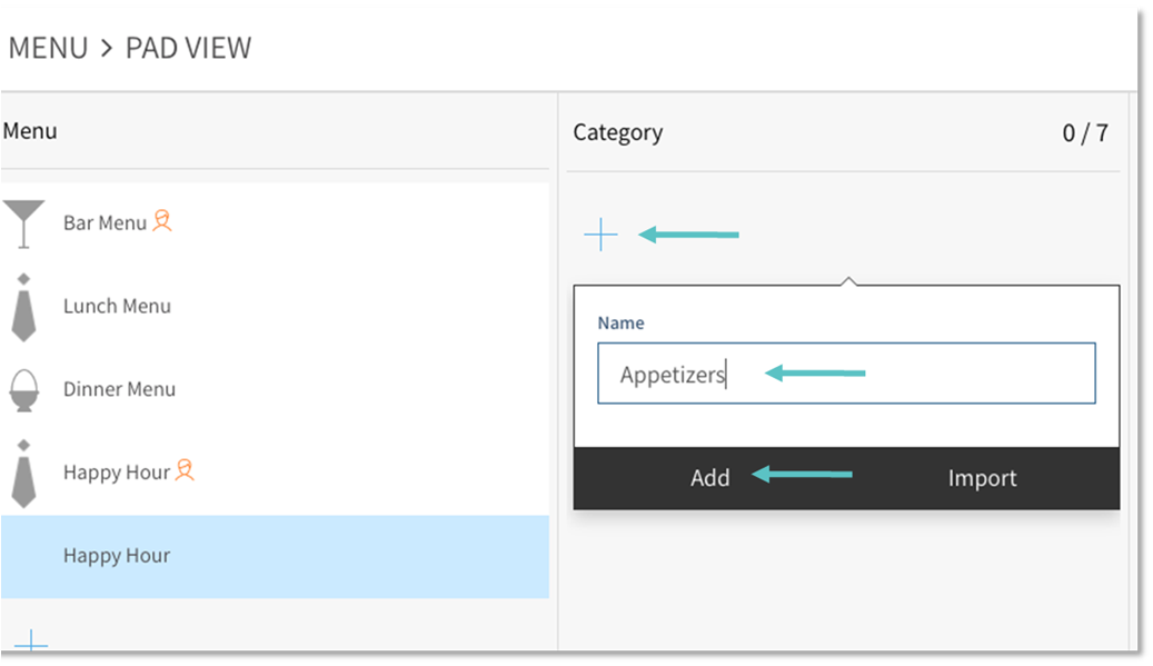 Add a Category to the menu by selecting the + Icon under the Category column. Add a Name, then select Add