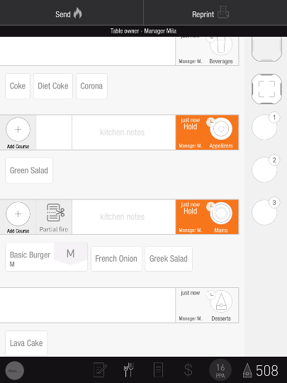 Orders can be fired from multiple places on the PAD: order screen, course screen, and tables screen