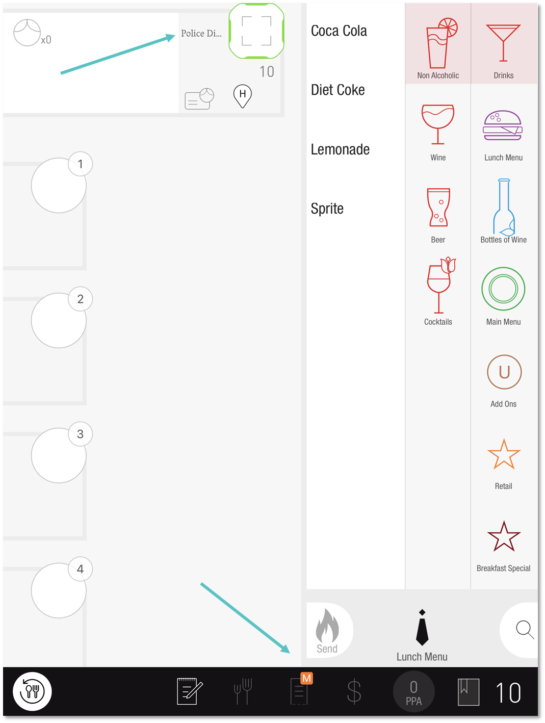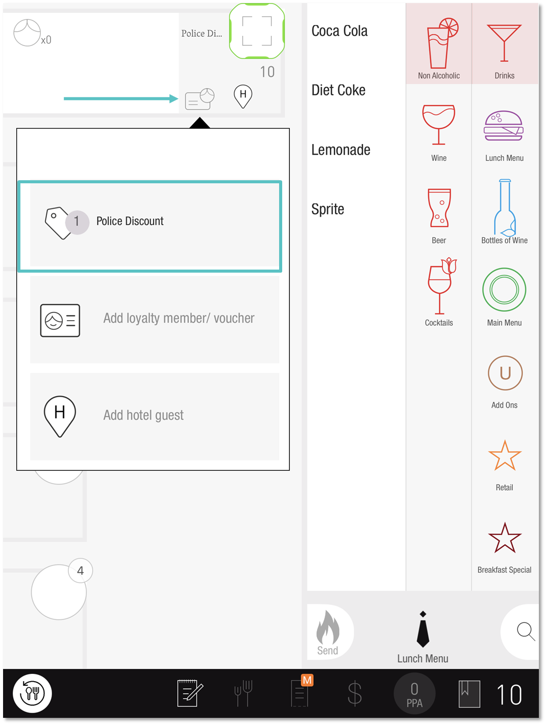 Once applied, the selected Tag will appear in the shared seat next to the table number and an Orange M will indicate on the Check screen if Manager approval is required