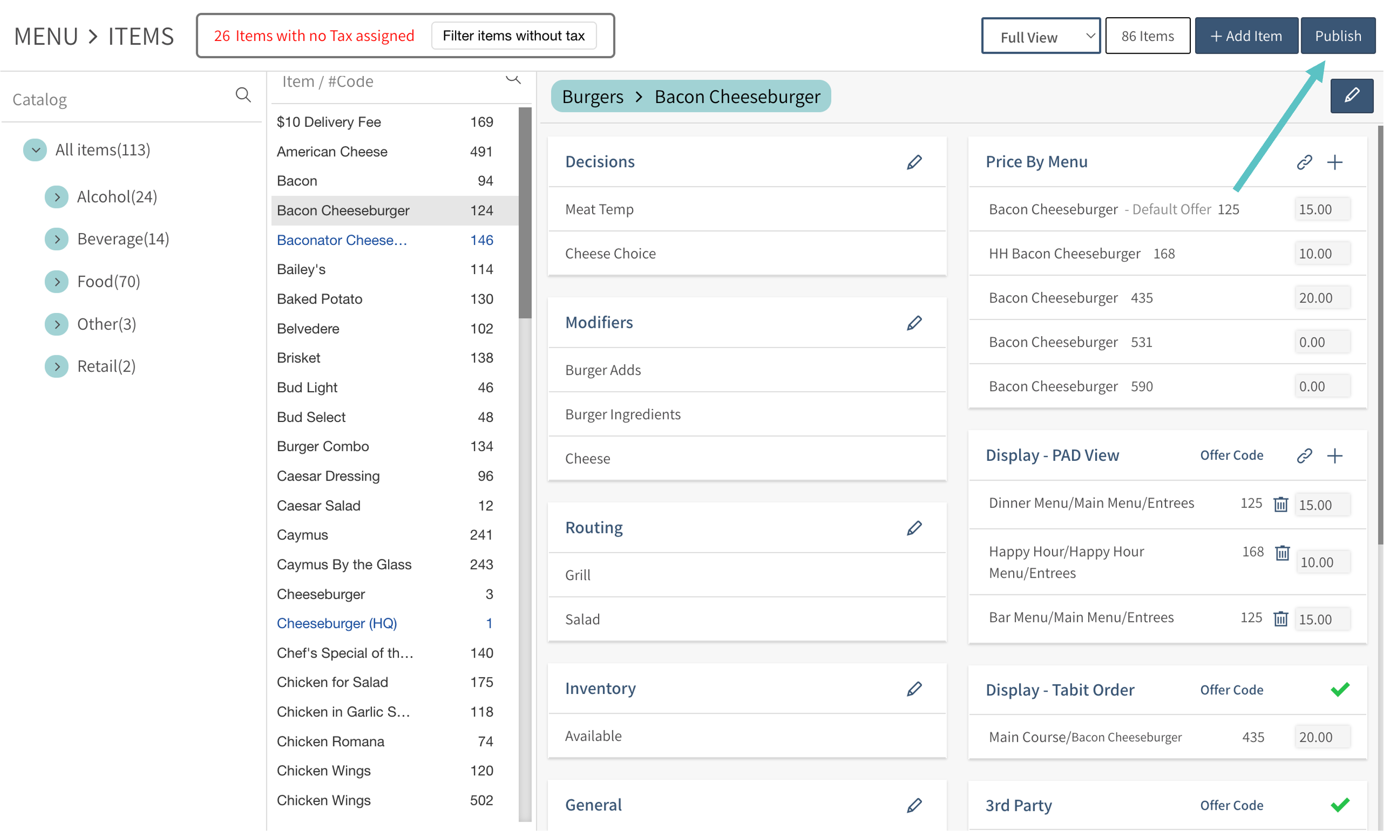 In Tabit Office, go to Menu > Items and find the relevant Item through the Catalog or by searching by the Item name or code