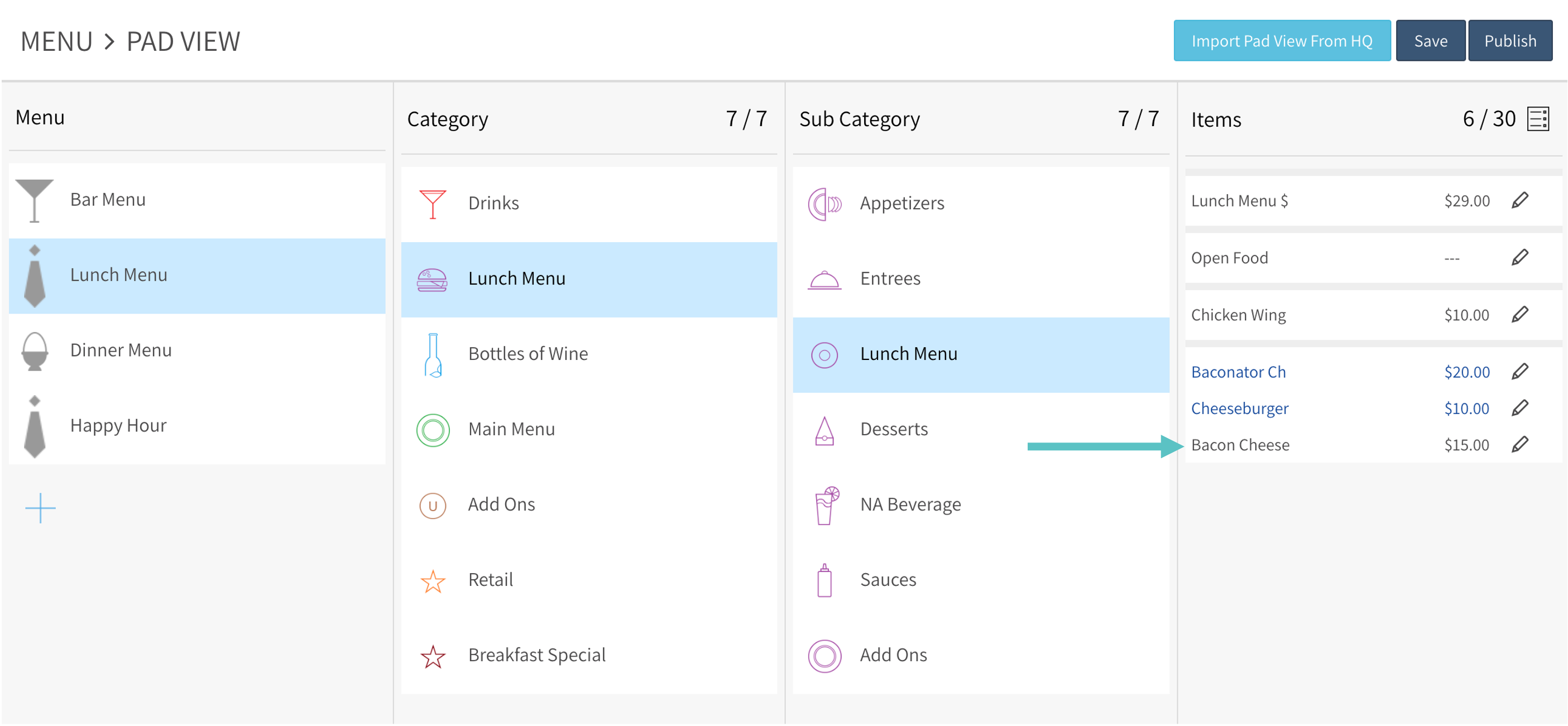 Any changes made to the Menu catalog will NOT appear in the PAD if they aren't published
