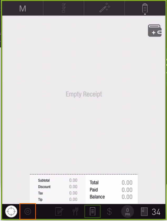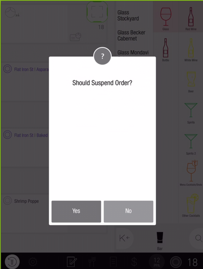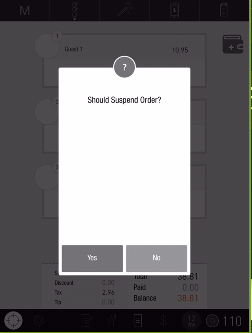 If you are unable see or swipe from right to left to find the “Suspend” button from the check screen, you can still suspend the order by tapping the grayed out “Setting” icon from any screen.