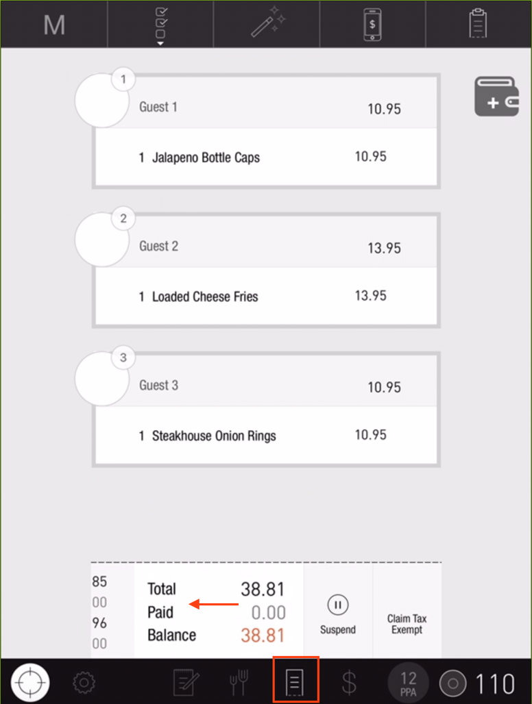 To suspend an order, go to the check screen and swipe from right to left starting from where it says “Total, Paid, Balance”.