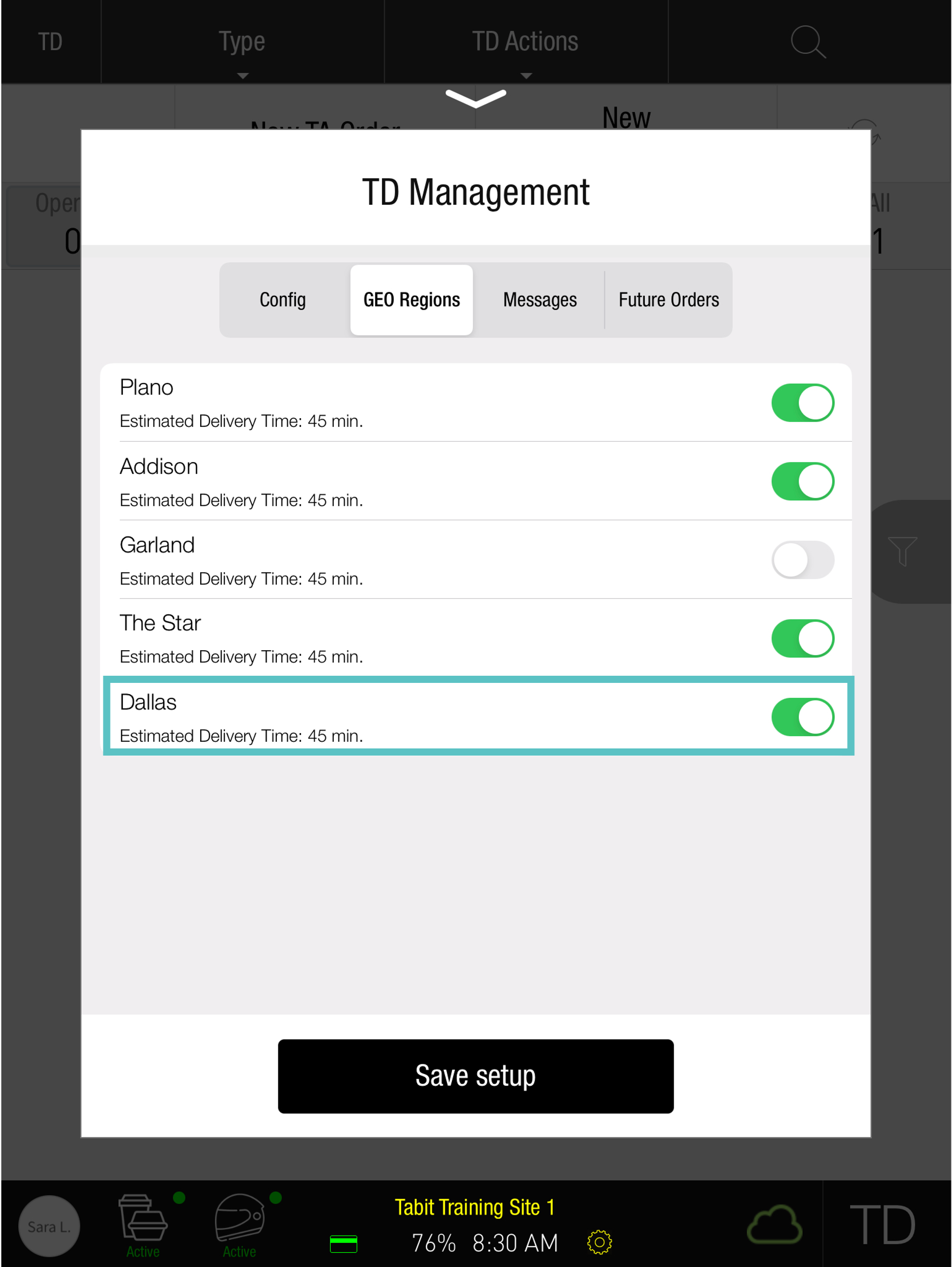 In Tabit Office, go to Tabit Order > Site Setup and select the Delivery Regions tab