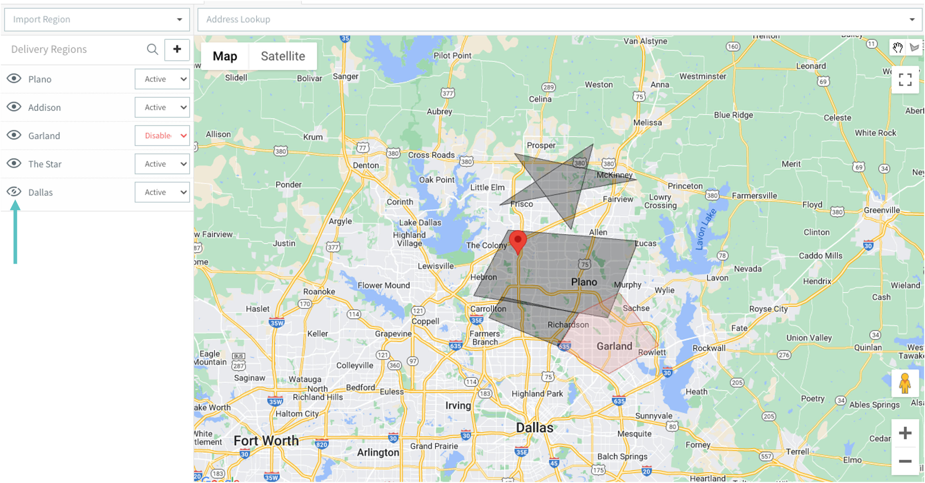 Now the delivery region has been hidden and the Eye icon has a line through it. This means it won't appear on the map