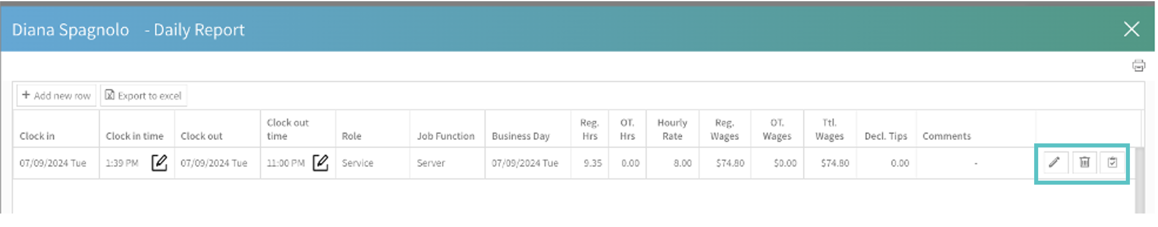 Export to Excel (Detailed): This will generate an excel file with a detailed report of the employees who worked during a defined period, including all their recorded shifts, roles, wages, declared tips, as well as any notes and comments.