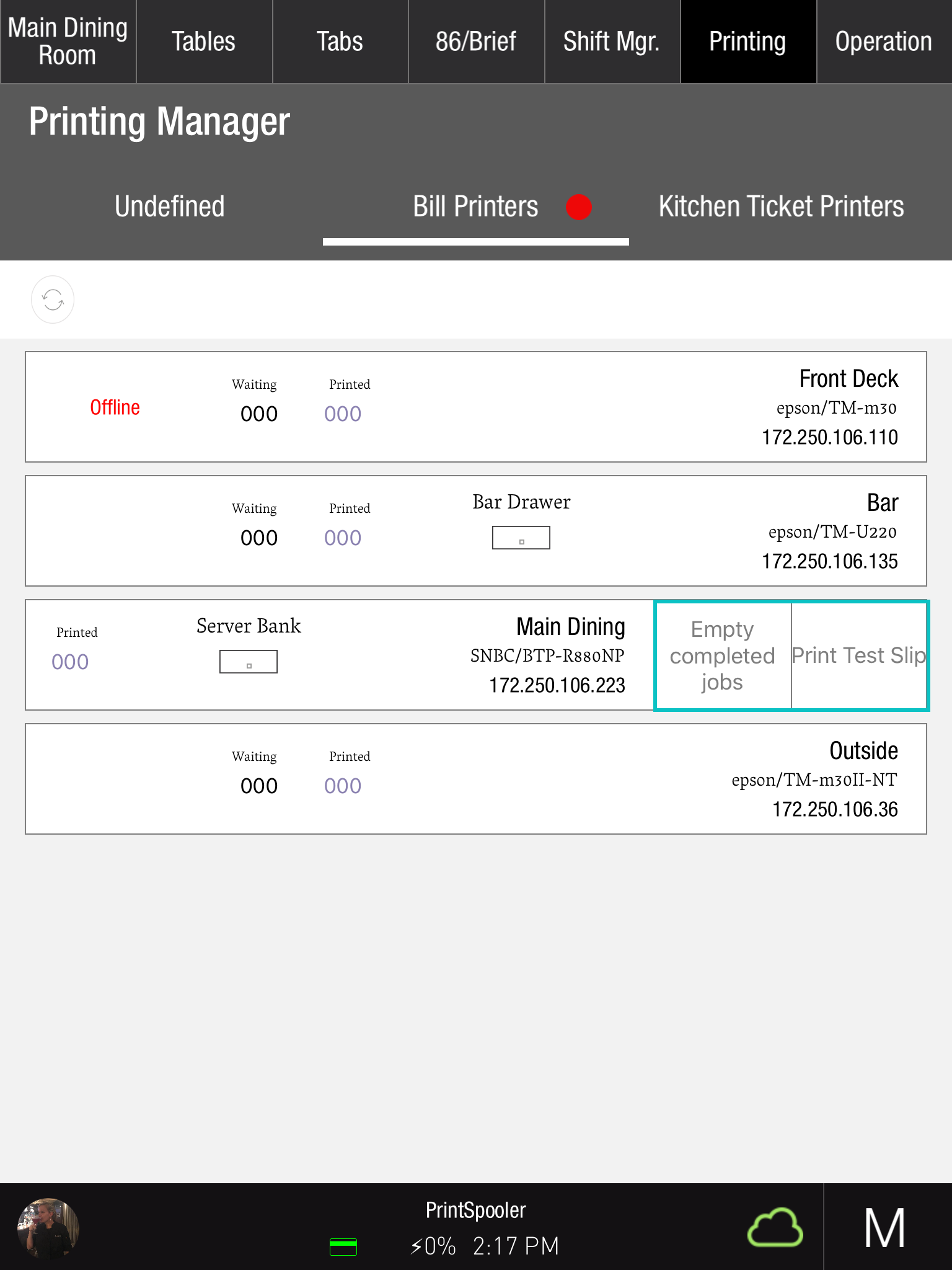 This screen displays the PAD Bill Printers and Kitchen Ticket Printers: